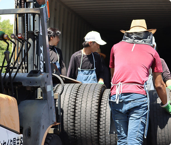 回収した廃タイヤ(使用済みタイヤ)の中からリトレッドタイヤとして再利用できる品質のものを「台タイヤ」として選別し、国内のタイヤメーカー関連会社の再生工場および海外のタイヤ再生工場への輸出をしております。